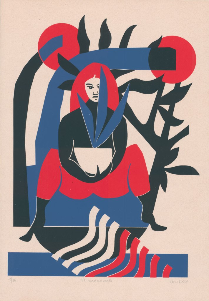 Ergänzt wird die Ausstellung durch Linoldrucke weiterer lateinamerikanischer Künstler*innen, darunter Carlos Andrés Carrillo und Toxicómano Callejero. Diese Arbeiten greifen das Thema Mystik und Tropical Gothic auf und bieten einen spannenden Kontrast sowie einen poetischen Exkurs in unterschwelligere, symbolisch aufgeladene Ausdrucksformen des zeitgenössischen Lateinamerikas.